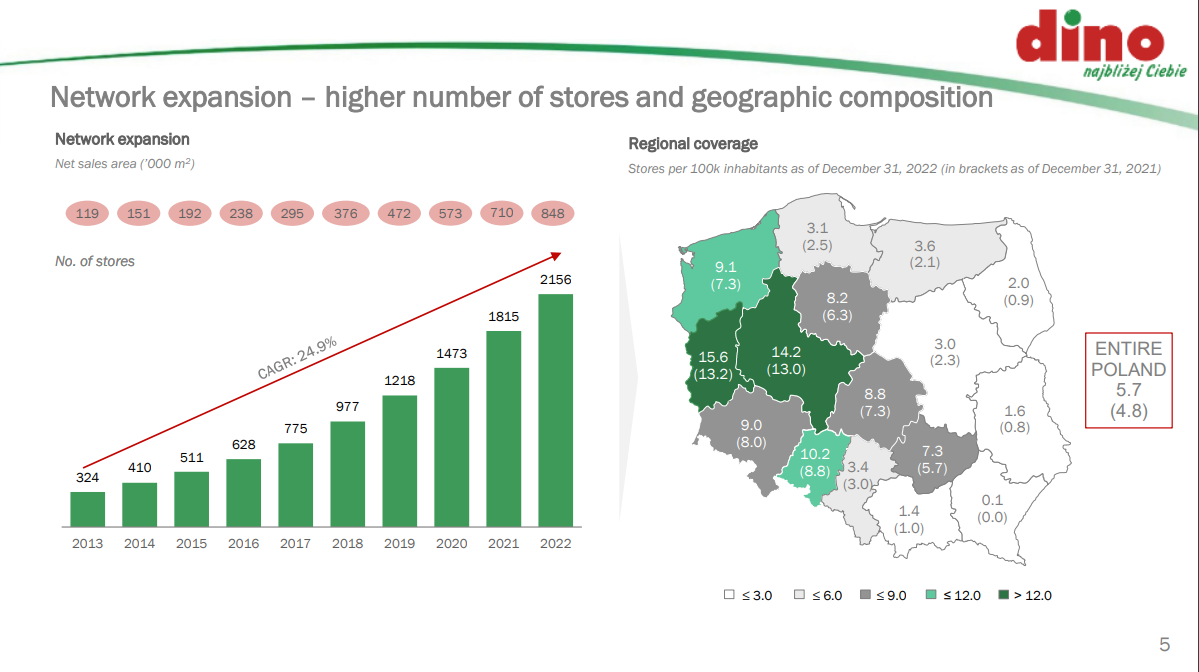 Due to various structural competitive advantages (small store footprint, optimal location, and primarily owned rather than leased land), Dino Polska is able to continually expand its network at the expense of larger competitors.
