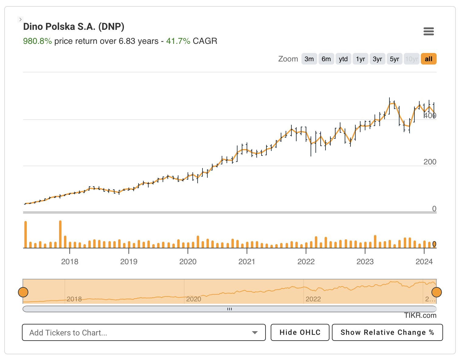 An example of a simple, easy-to-understand, and predictable asset is the Polish company Dino Polska ($DNP.WA). Dino Polska has been Poland’s fastest growing supermarket chain over the past decade. Since 2010, store count has grown from 111 to 2,406, a 25.16% CAGR.